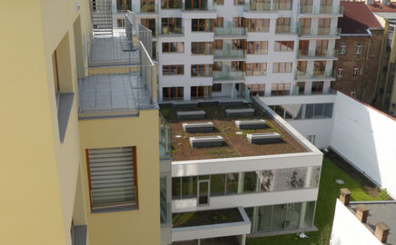 Výhled z bytu a balkonu do vnitrobloku a klidné zahrady, která je přístupná pouze rezidentům. Dominantou tohoto příjemného a klidného místa se stala nádrž s fontánou a přepadem. Většinu ploch vytváří celoročně pochozí trávníky.